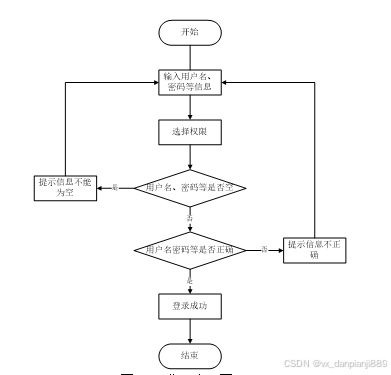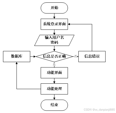 用户打开并进入系统后,会先显示登录界面,输入正确的用户名和密码,系统自动检测信息,若信息无误,则用户会进入系统功能界面,进行操作,否则会提示错误无法登录,操作流程如图2-3所示。