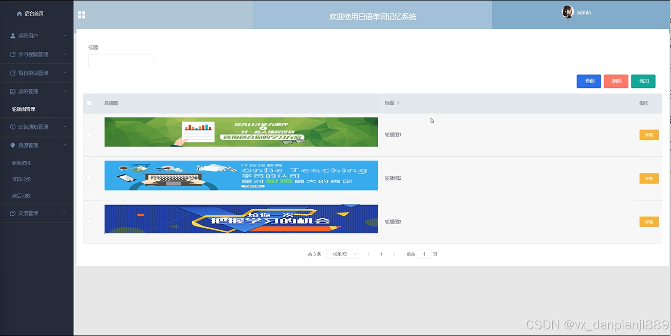 - 系统管理:管理员可以对系统的轮播图进行管理,包括查看、添加、删除和搜索轮播图。管理员可以根据标题进行搜索,确保轮播图的准确性和时效性。