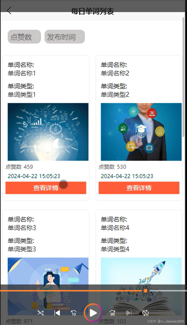 学生用户可以浏览每日单词列表,查看单词名称、类型、日语和中文意思以及听力内容等信息。他们可以通过搜索功能快速定位单词,并对单词进行收藏、点赞和评论,促进单词记忆和应用。其界面如下图4-5所示。