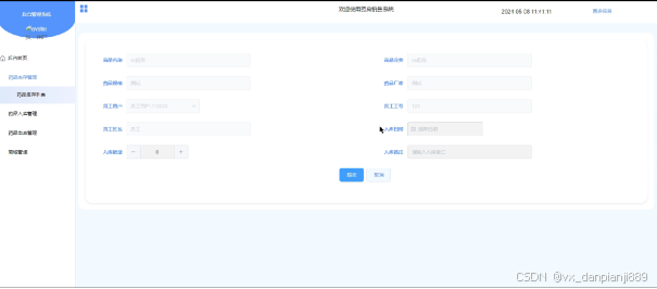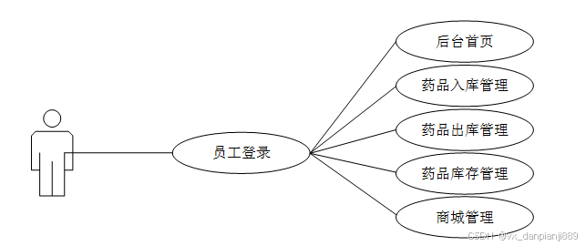 员工用户注册登录成功后,可以进行药品库存管理、药品入库管理、药品出库管理、商城管理等功能。
