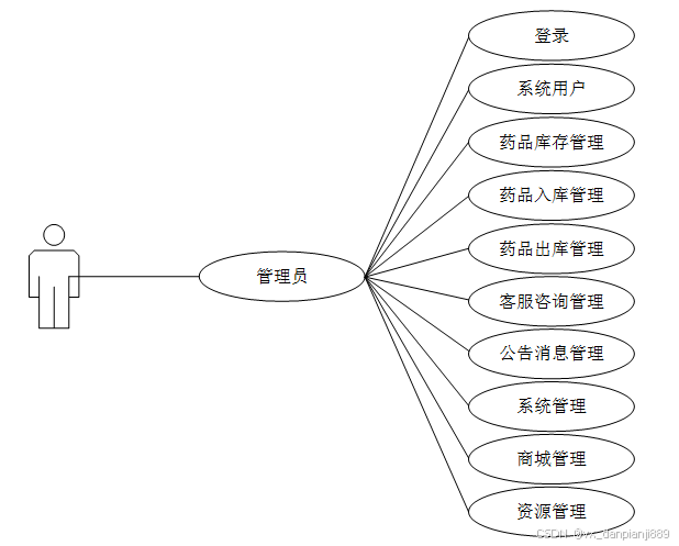 管理员登录成功后,可以进行用户管理、药品库存管理、药品入库管理、药品出库管理、客服咨询、系统管理、资源管理、公告消息管理、商城管理等功能。