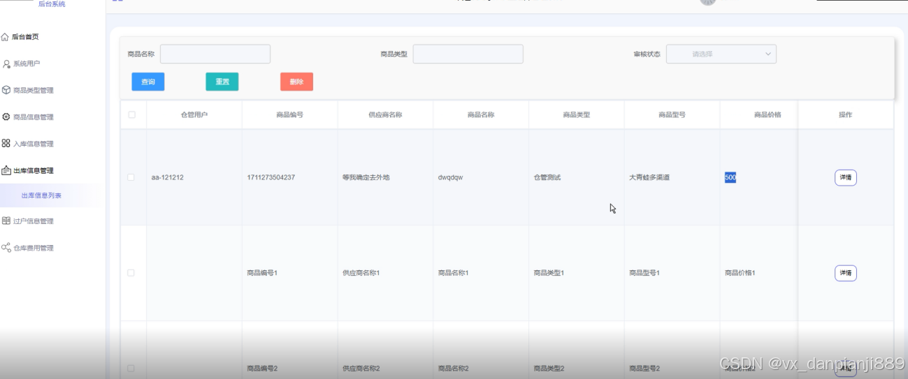 管理员可以记录商品的仓管费用信息,包括出库数量、日期、目的地等信息的录入和查询。界面如下图所示。