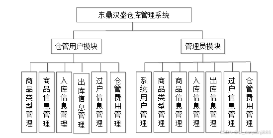 模块包括管理员模块和仓管用户模块,登录进去对应相应的功能,具体的功能模块图: