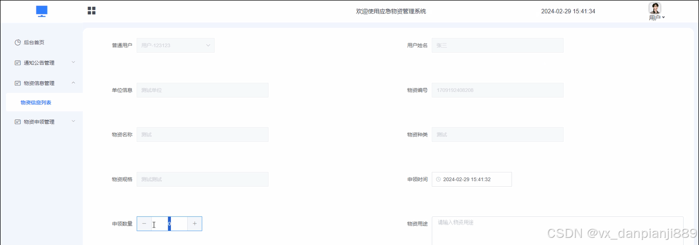 (6)物资信息管理:管理员点击可查看物资信息列表和物资信息管理;点击“物资信息添加”,如物资编号、物资名称,选择物资种类,输入物品规格和数量,点击“提交”按钮进行添加。
