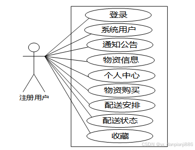 农用物资销售配送管理系统中注册用户角色功能包含了注册登录、通知公告、物资信息、-个人首页、物资购买、配送安排、配送状态、收藏等功能,用户的用例图如图2.1所示: