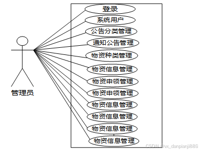 农用物资销售配送管理系统中管理员角色功能包含了登录、系统用户、物资分类管理、配送车辆管理、物资信息管理、配送安排管理、出库信息管理、配送状态管理、入库信息管理、系统管理、通知公告管理、权限管理等功能,管理员的用例图如图2.2所示: