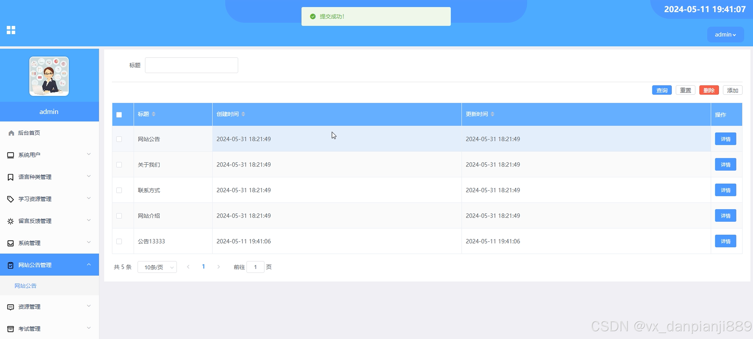 通过管理员功能页面,用户可以查看首页、系统用户(管理员、注册用户)、语言种类管理、学习资源管理、留言反馈管理、系统管理、网站公告管理、资源管理(学习资讯、资讯分类)、考试管理(科目列表、试题库、错题记录、试卷列表)、交流管理(交流论坛、论坛分类)、权限管理、个人信息、修改密码等,并且可以根据需要进行相应的操作,如图5-7所示。