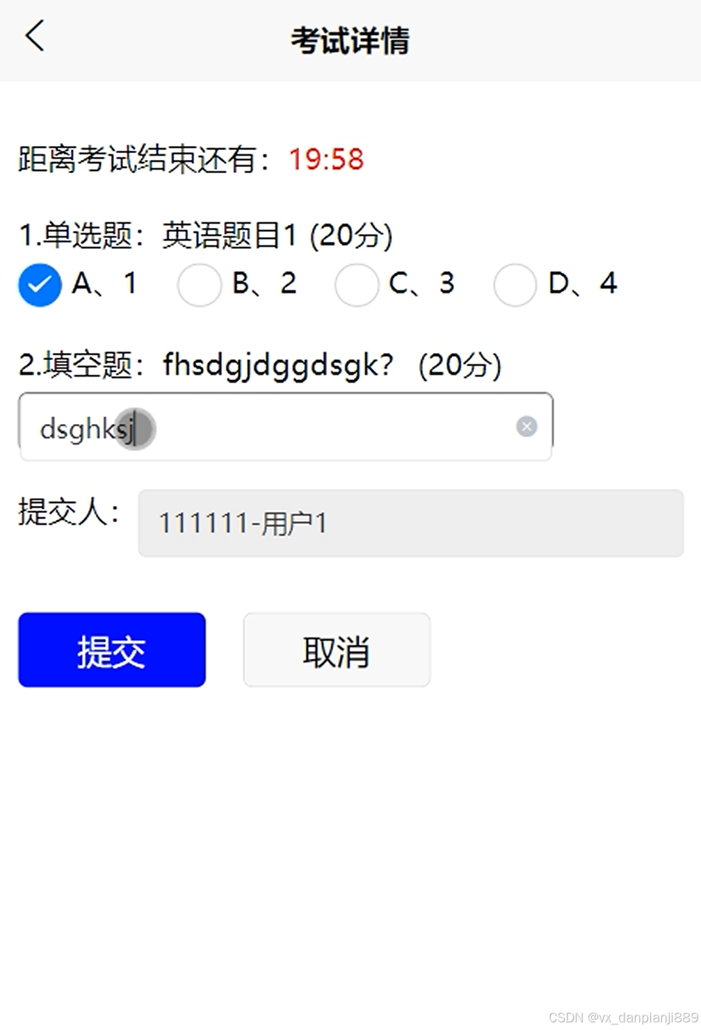 在在线测试页面,当用户点击下方导航栏“在线测试”这一菜单按钮,会显示所以相关内容,可以填写提交等操作。如图5-5所示。