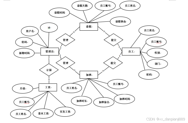 基于前述数据流程图,我们设计了一个完整的系统,它包含了管理员、员工、加班信息以及请假信息等多个实体,其中,员工可以提交申请,管理员可以进行审核,以确保申请的准确性和及时性。管理员通过员工请假和加班的信息计算出来员工工资信息。
