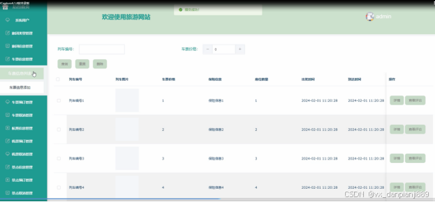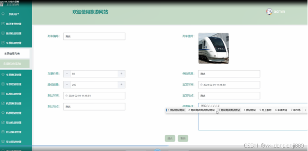 旅游网站中的管理人员可以查看列车编号、列车图片、车票价格、保险信息、座位数量、出发时间、到达时间等详情,还可以进行查询、重置、删除等操作。管理员输入列车编号、车票价格、座位数量、到达时间、到达地点、保险信息、出发时间、出发地点、信息备注等信息点提交,可以对车票信息进行添加。车票信息列表和车票信息添加表界面如下图所示。