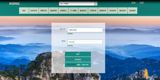 - 注册登录界面:注册用户是可以通过自己的账户名和密码进行登录的,当用户输入完整的自己的账户名和密码信息并点击“登录”按钮后,将会首先验证输入的有没有空数据,再次验证输入的账户名+密码和数据库中当前保存的用户信息是否一致,只有在一致后将会登录成功并自动跳转到旅游网站的首页中;否则将会提示相应错误信息。