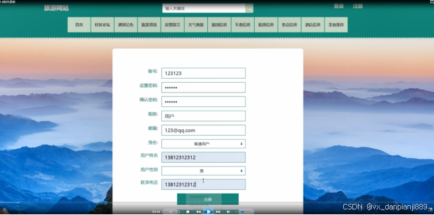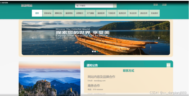 - 注册首页界面:在旅游网站的首页界面上采用了上下的方式来布局界面,上面是导航栏,下面是通知公告。