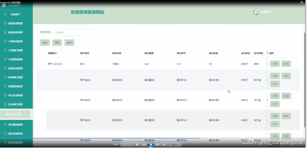 旅游网站中的管理人员可以查看用户姓名、景点名称、景点星级、景点证分、景点价格、支付状态、支付类型等详情,还可以进行查询、重置、删除等操作。景点预订管理界面如下图所示。