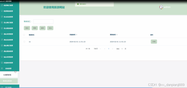 旅游网站中的管理员可以对系统前台展示的轮播图和敏感词进行增删改查,方便用户进行查看。轮播图和敏感词管理界面如下图所示。