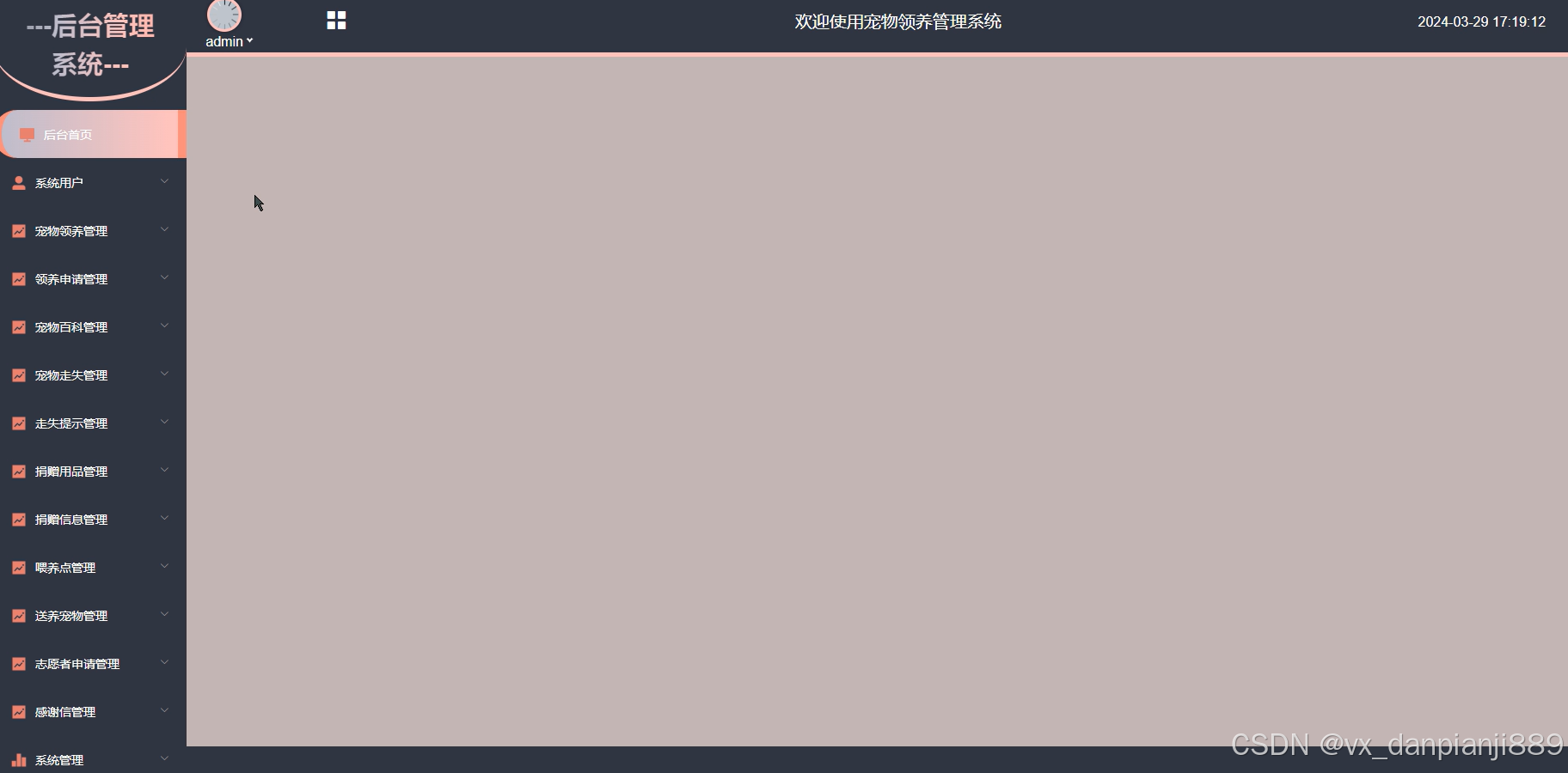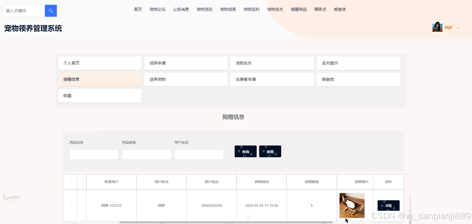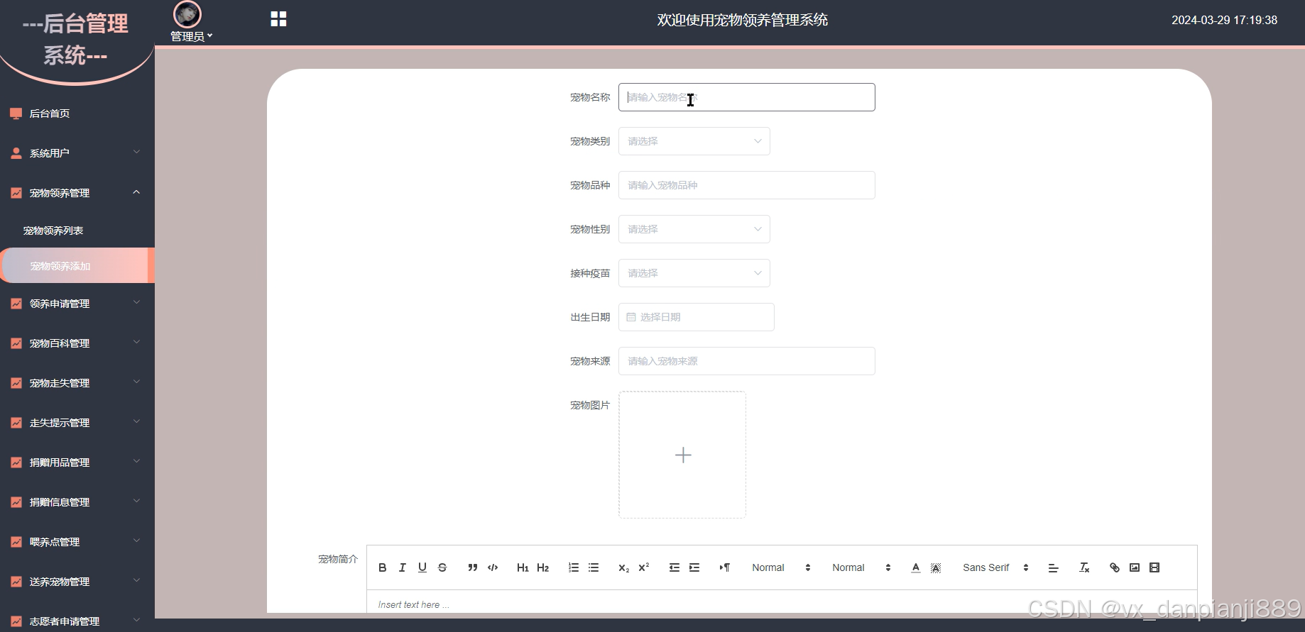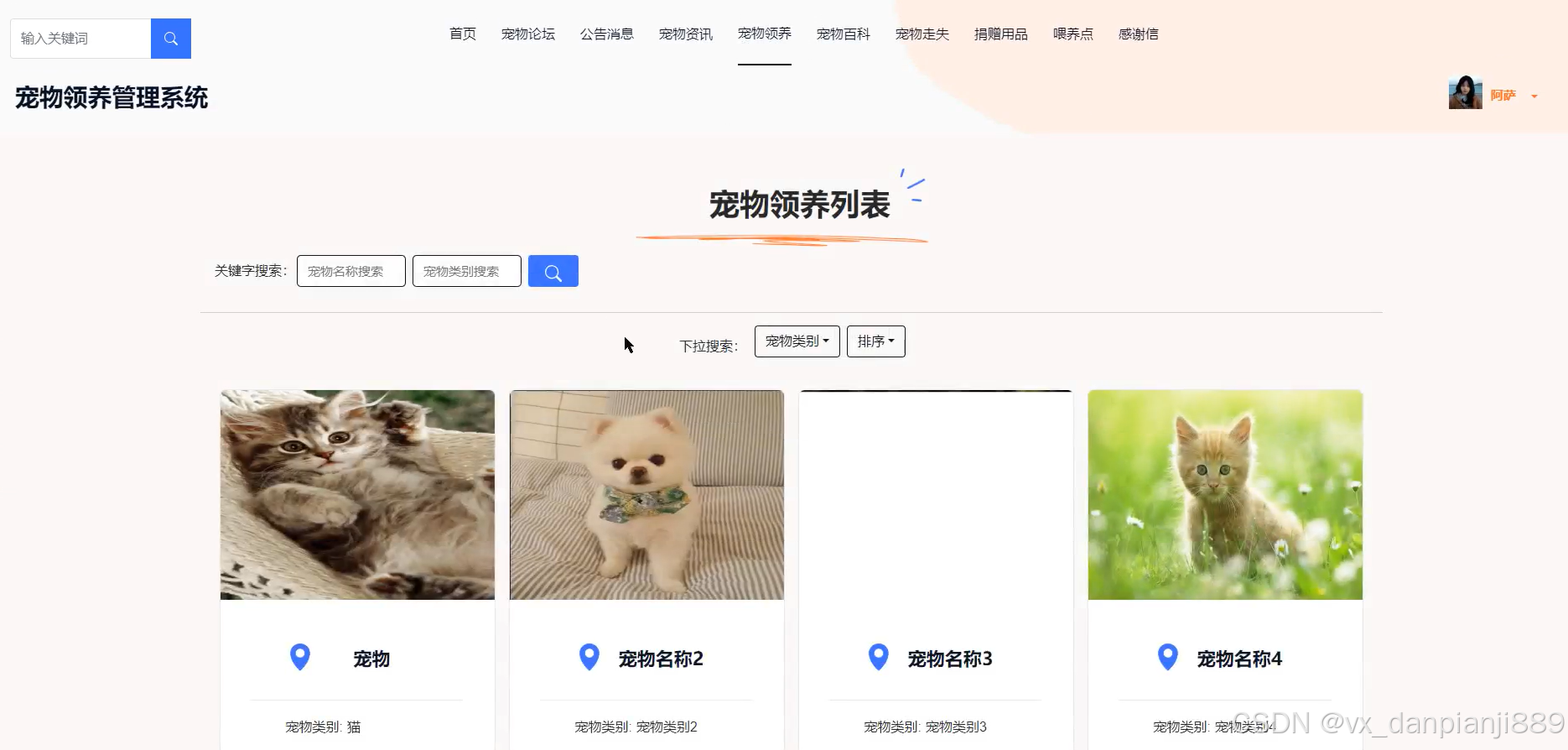 The pet adoption management system is an online platform dedicated to promoting pet adoption, pet care, and pet information sharing. This article is based on the Spring Boot framework and designs and implements a complete pet adoption management system, which includes two roles: ordinary user and administrator. It covers functional modules such as user registration, login, pet adoption publishing, pet lost information publishing, and pet information retrieval. The system has a good user interaction interface and rich functions, providing a convenient platform for pet enthusiasts to communicate, adopt, and care for pets.
