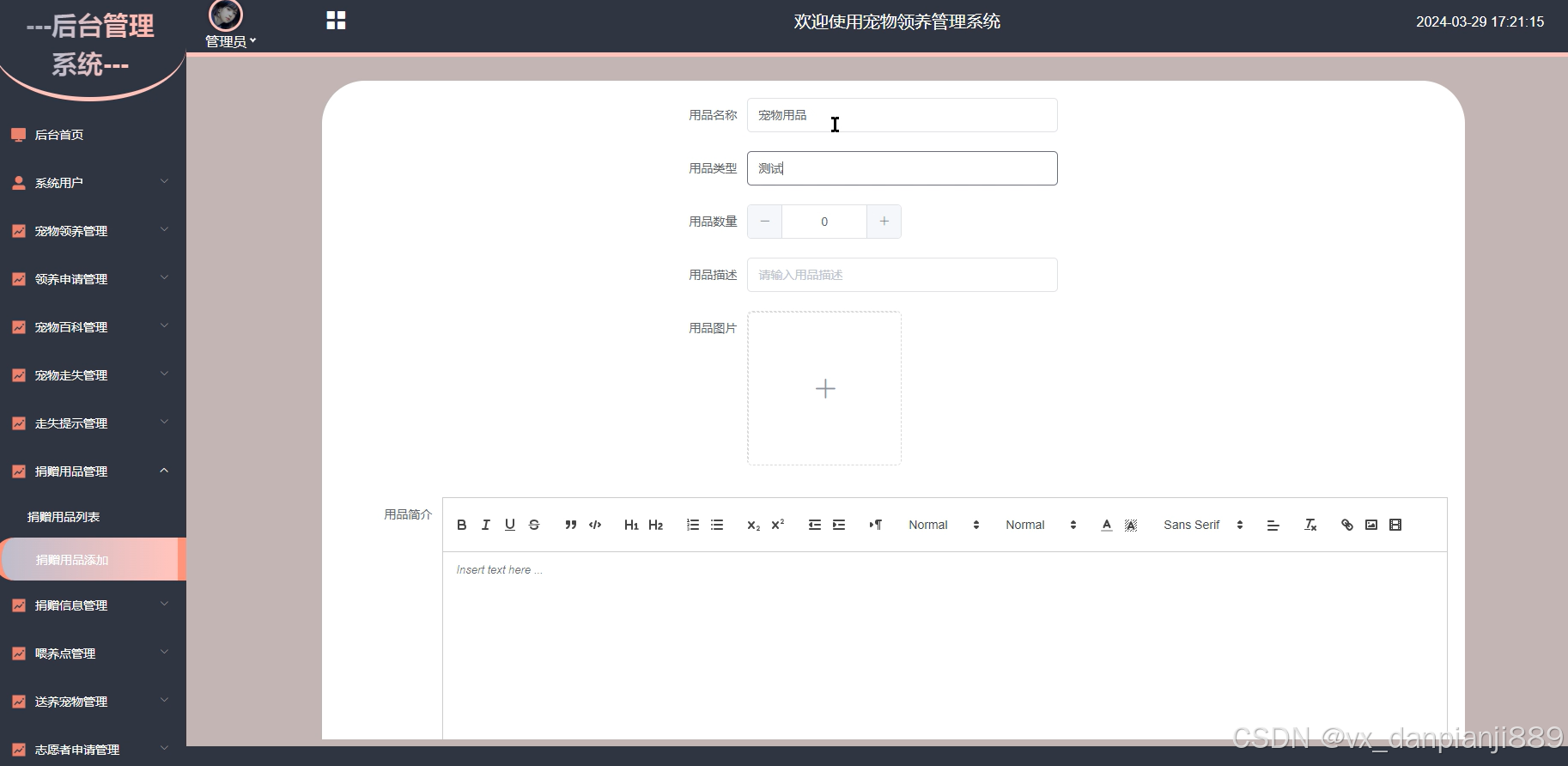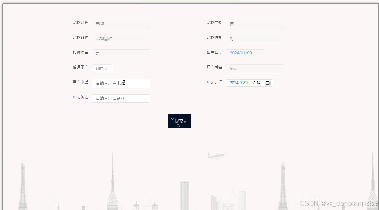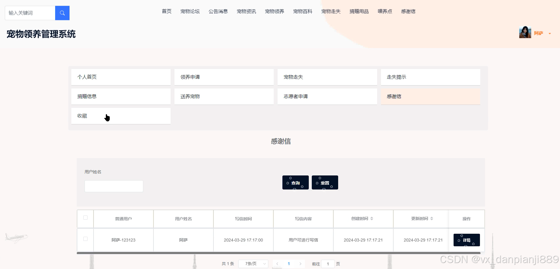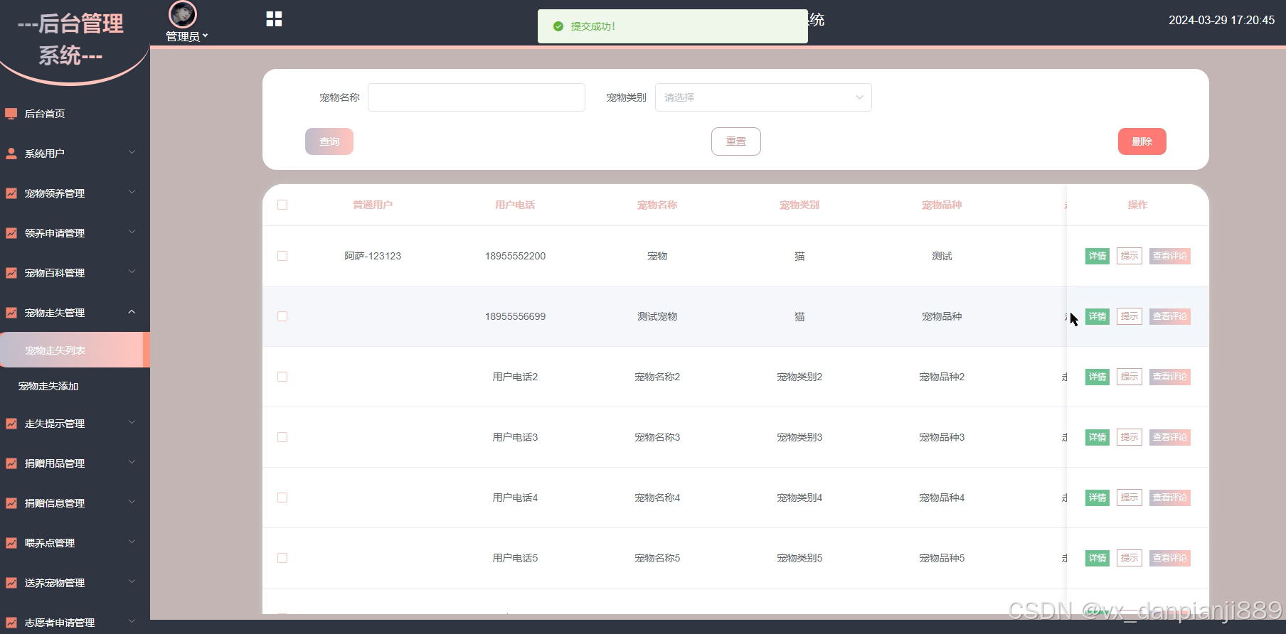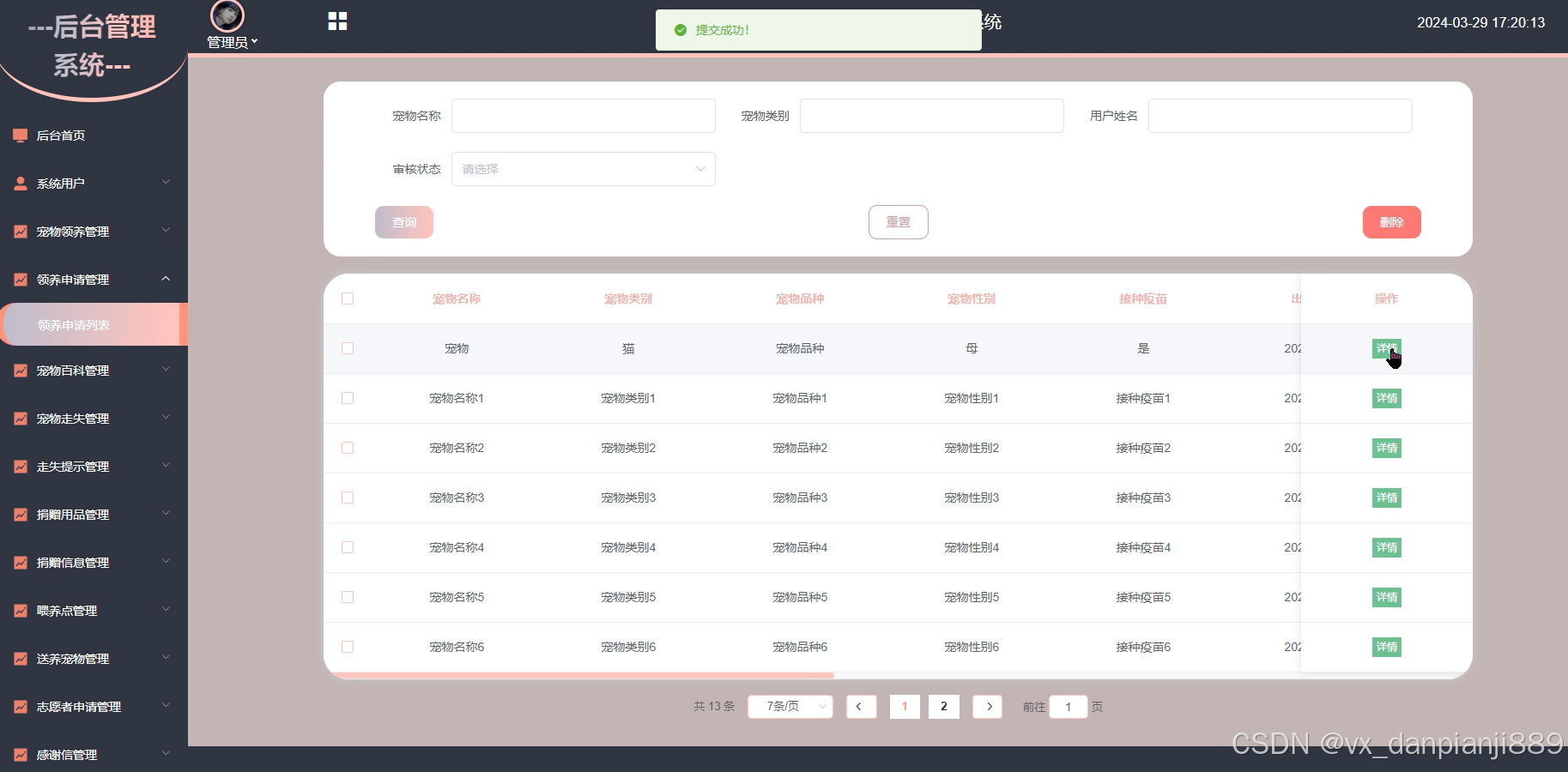 The pet adoption management system is an online platform dedicated to promoting pet adoption, pet care, and pet information sharing. This article is based on the Spring Boot framework and designs and implements a complete pet adoption management system, which includes two roles: ordinary user and administrator. It covers functional modules such as user registration, login, pet adoption publishing, pet lost information publishing, and pet information retrieval. The system has a good user interaction interface and rich functions, providing a convenient platform for pet enthusiasts to communicate, adopt, and care for pets.
