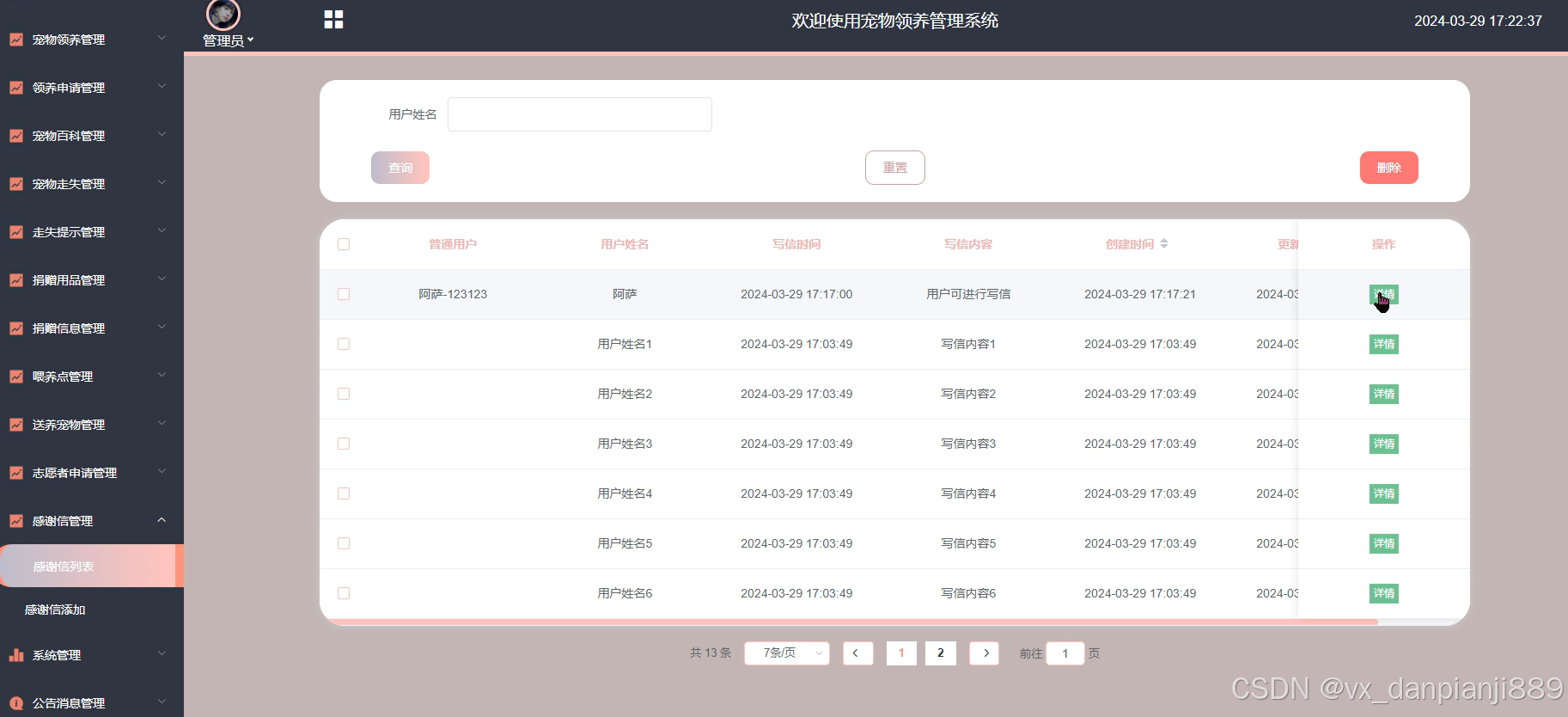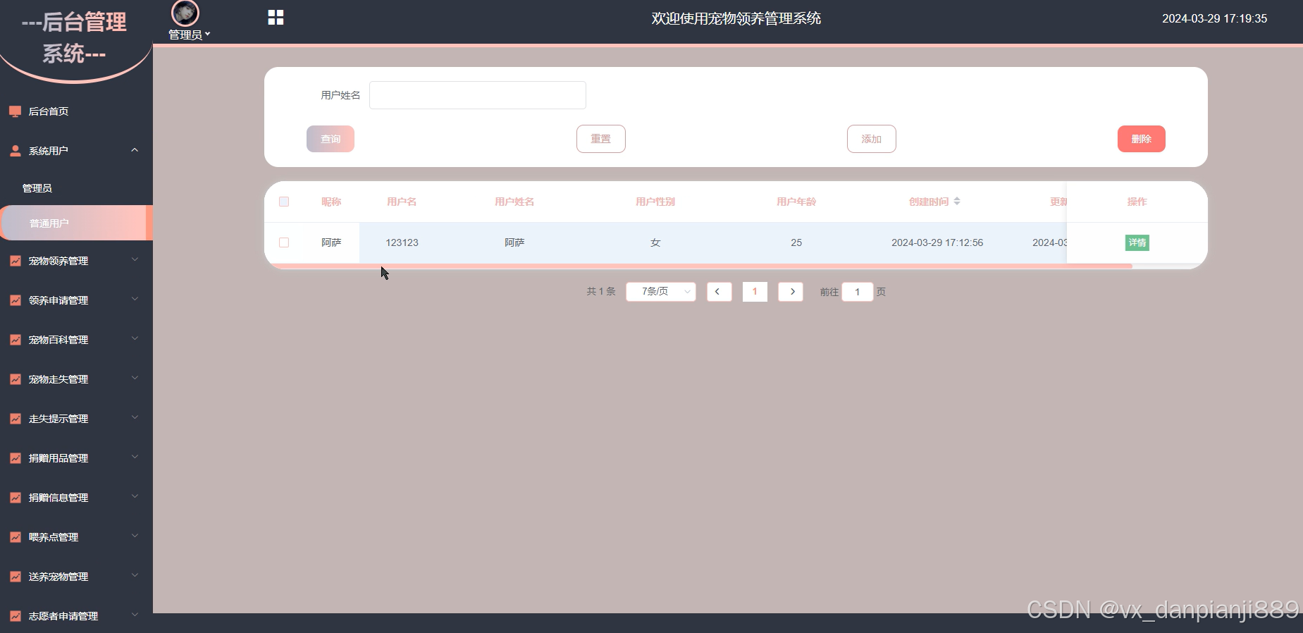 宠物领养管理,在宠物领养管理页面可以查看宠物领养列表、宠物领养添加等内容,并可根据需要对宠物领养信息进行详情、查询或删除等操作,如图5-3所示。