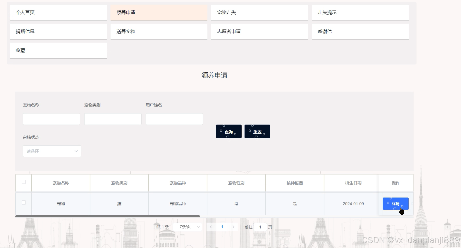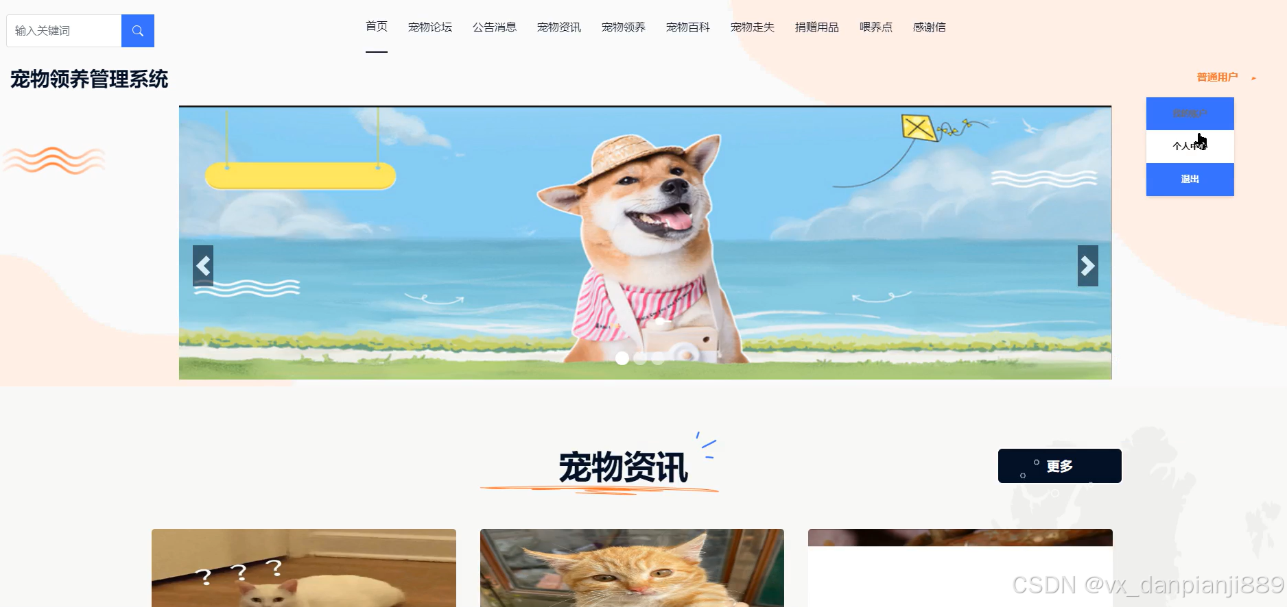 关键词:宠物领养管理系统;springboot框架;Mysql数据库