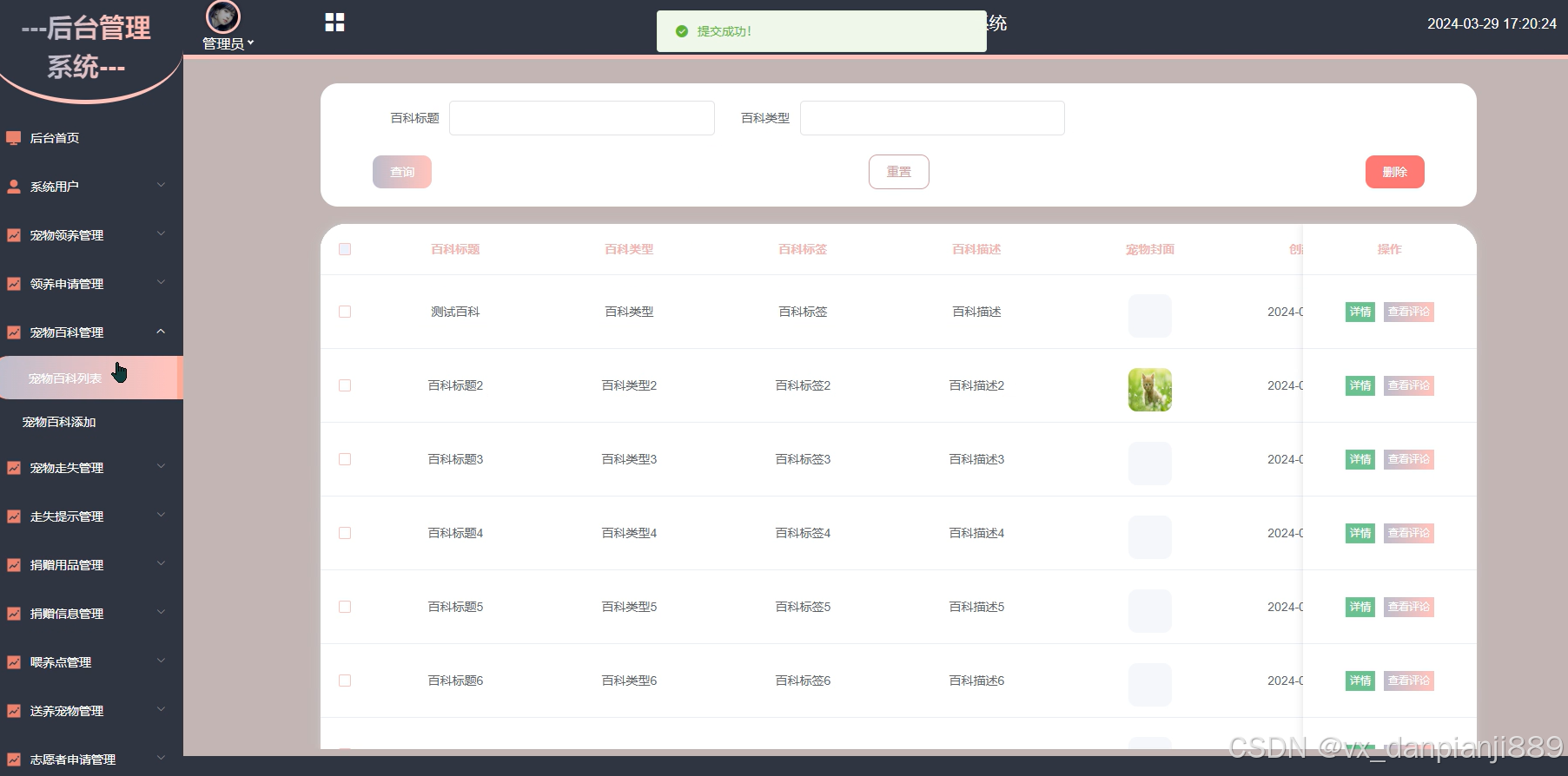 宠物百科管理,在宠物百科管理页面可以查看百科标题、百科类型、百科标签、百科描述、宠物封面等内容,并可根据需要对宠物百科信息进行添加、查询或删除等操作,如图5-6所示。