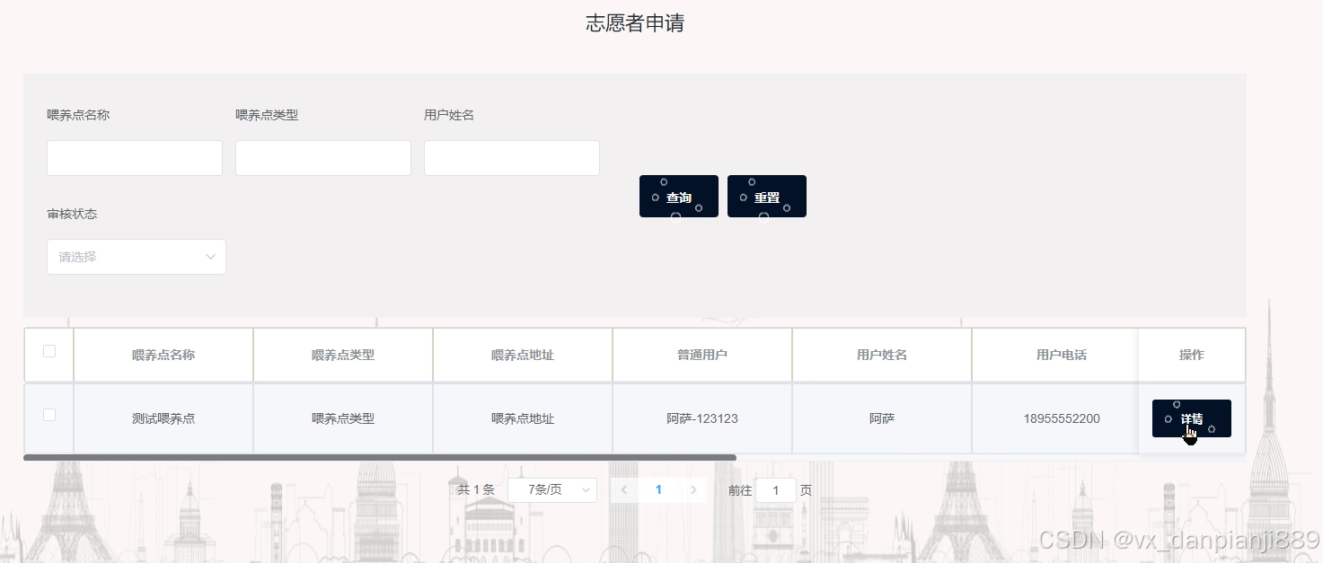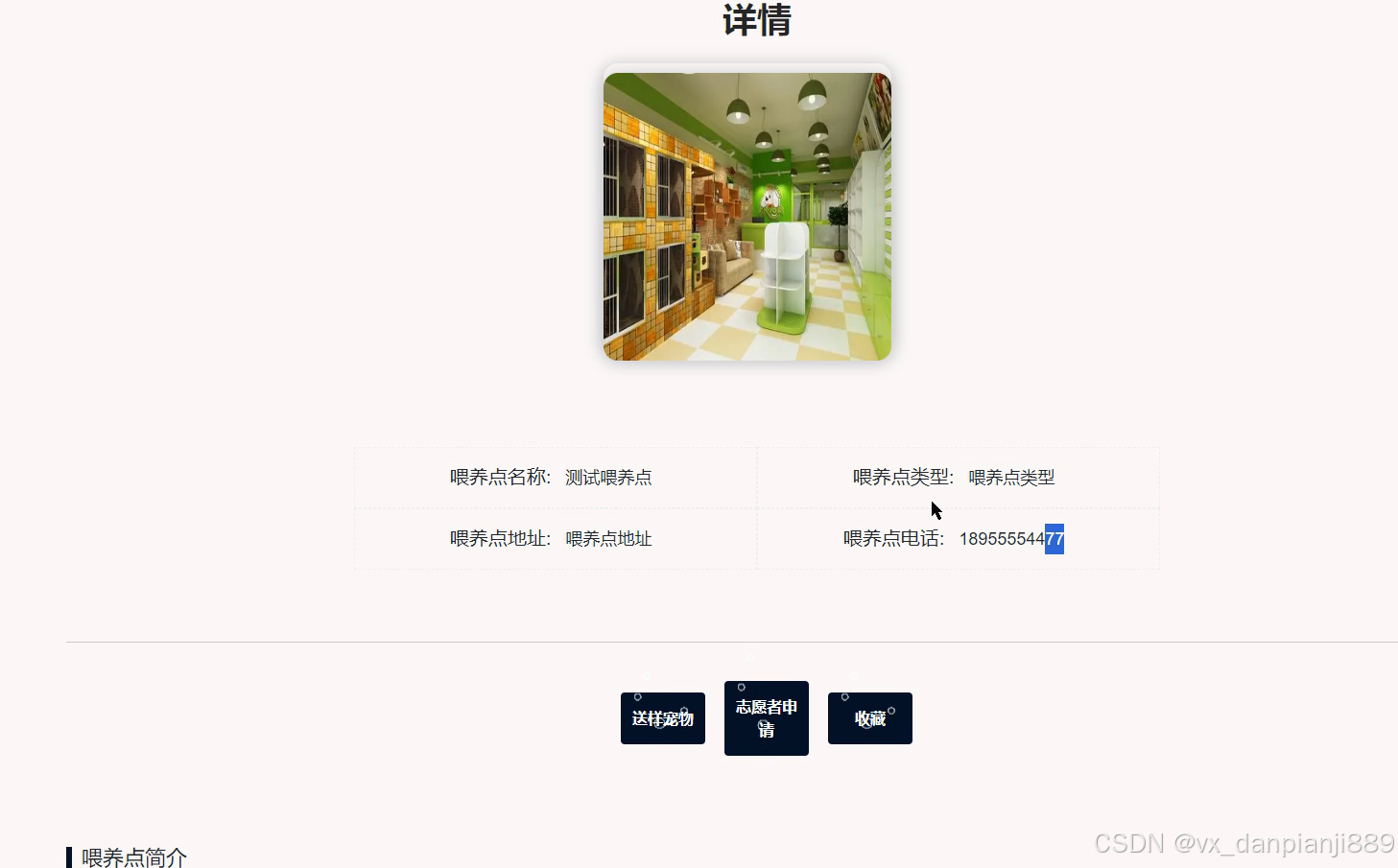 喂养点,在喂养点页面查看喂养点名称、喂养点类型、喂养点地址、喂养点电话等内容并可根据需要对喂养点信息进行送样宠物、志愿者申请、收藏等操作,如图5-18所示。