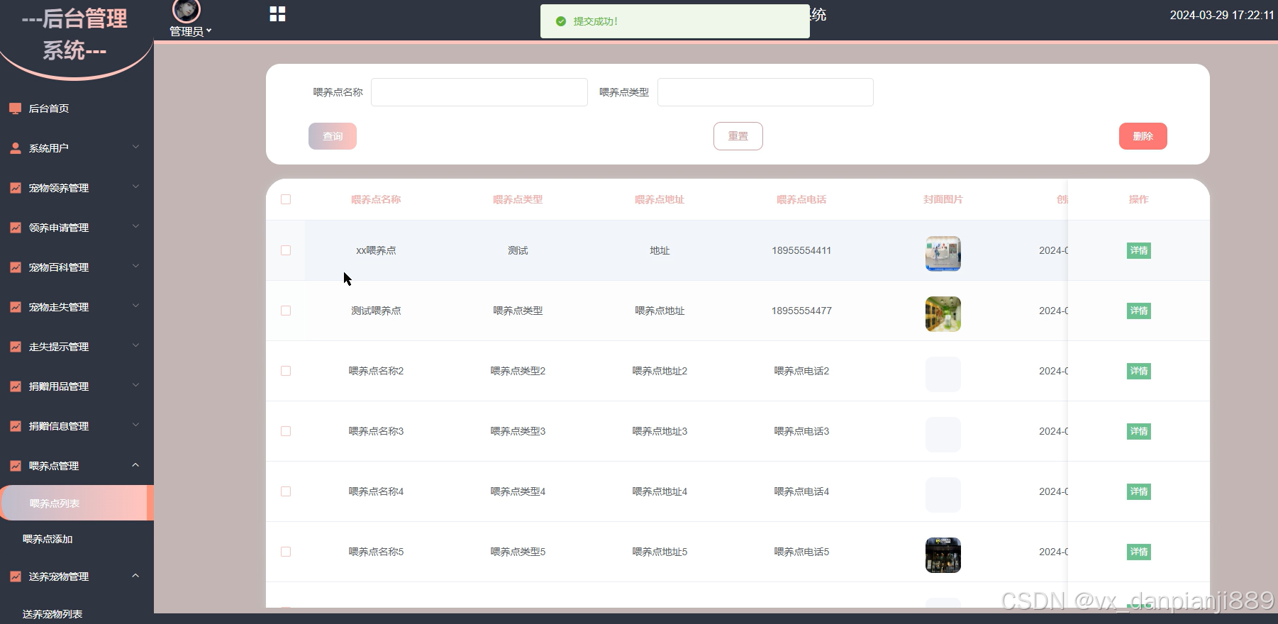 喂养点管理,在喂养点管理页面可以查看喂养点名称、喂养点类型、喂养点地址、喂养点电话、封面图片等内容,并可根据需要对喂养点信息进行添加、查询或删除等操作,如图5-9所示。