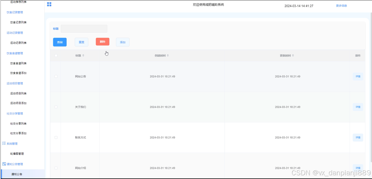 运动推荐管理:管理员可以管理用户的运动推荐内容详情,包括查看列表、查询、重置、删除、查看详情,管理用户的运动记录。