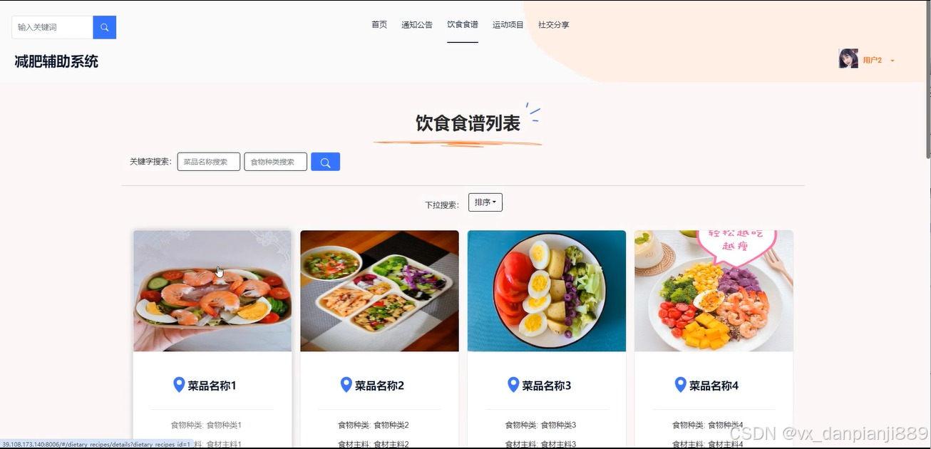 饮食食谱:用户查看饮食食谱列表的所有信息,包括食物种类、食材主料等。输入关键字进行下拉搜索。用户对喜欢的食谱进行点赞、收藏和发表评论并可查看饮食视频。界面如下图所示。