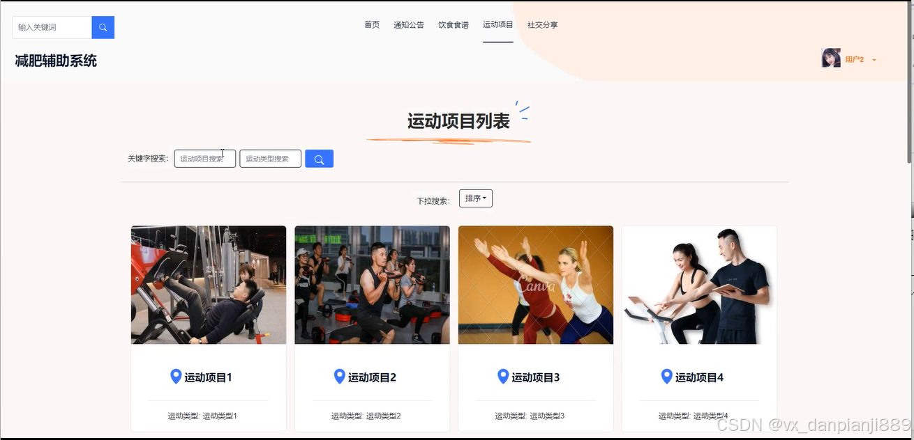 运动项目:用户查询提供的运动项目的详情,包括增删改查操作,用户可上传自己喜欢的运动项目内容,与他人分享运动经验。