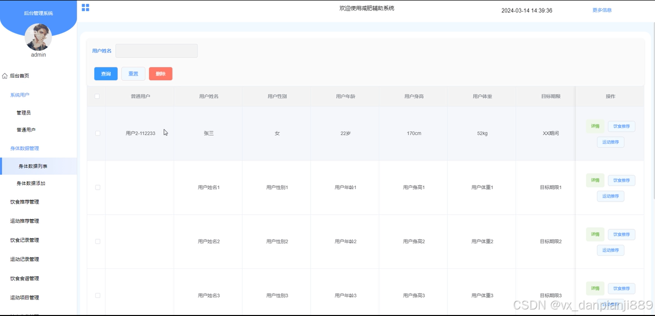 身体数据管理:管理员可以管理用户的身体数据详情,包括查看列表、添加新数据、查询、重置、删除、查看详情,可管理用户的饮食推荐和运动推荐。