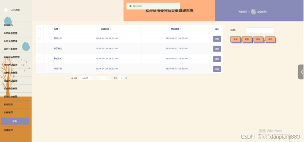 管理员点击“公告管理”这个菜单,可以对系统中的通知和公告进行管理,包括通知和公告的编辑、删除等操作。公告管理界面如下图所示。