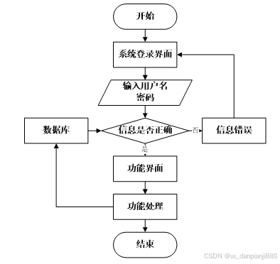 用户打开并进入系统后,会先显示登录界面,输入正确的用户名和密码,系统自动检测信息,若信息无误,则用户会进入系统功能界面,进行操作,否则会提示错误无法登录,操作流程如图2-3所示。