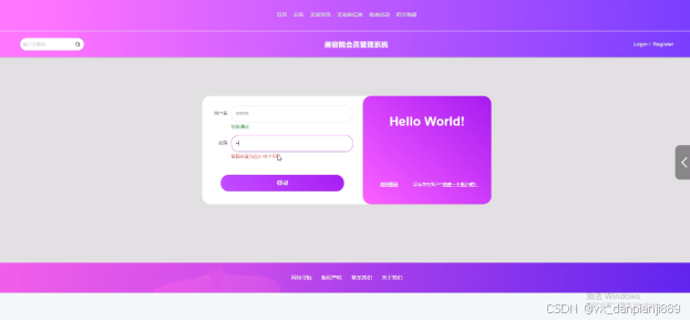 基于springboot的美容院会员管理系统中的注册后的用户是可以通过自己的账户名和密码进行登录的,当用户输入完整的自己的账户名和密码信息并点击“登录”按钮后,将会首先验证输入的有没有空数据,再次验证输入的账户名+密码和数据库中当前保存的用户信息是否一致,只有在一致后将会登录成功并自动跳转到基于springboot的美容院会员管理系统的首页中;否则将会提示相应错误信息,用户登录界面如下图4-2所示。