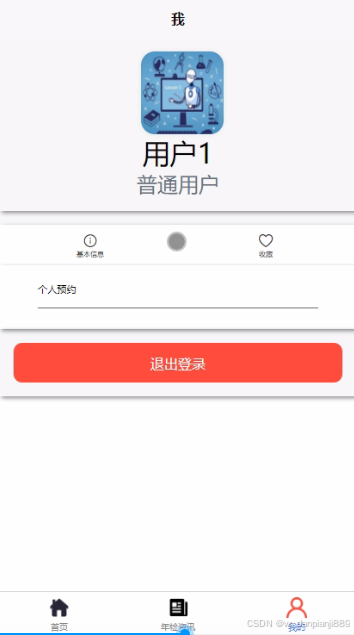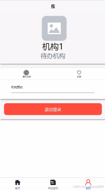 当待办机构用户点击右下角“我的”首页界面,可以进入基本信息、收藏、机构预约的功能进行设置、管理。“我的”首页界面如下图5-9所示。