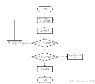 用户打开并进入系统后,会先显示登录界面,输入正确的用户名和密码,系统自动检测信息,若信息无误,则用户会进入系统功能界面,进行操作,否则会提示错误无法登录,操作流程如图2-9所示。