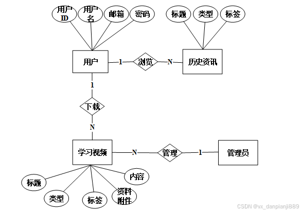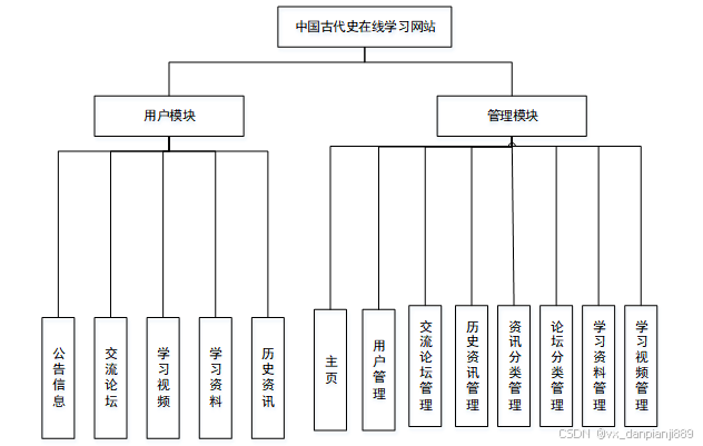 (3)确定好系统使用的技术,进行在线确认系统所划分的用户角色,并且根据用户角色划分确定所要设计的功能模块,对古代史在线学习网站的设计主要划分别为管理员和用户角色,并所使用的功能模块也相应不同,但是系统的数据库实现的内容是交互的,用户可以随时根据自己的需求进行课程信息,对于系统工作人员可以根据自己的分管内容进行在线信息的处理及操作,管理员获取到所有用户的详细数据信息,并根据需求进行第一时间处理解决。