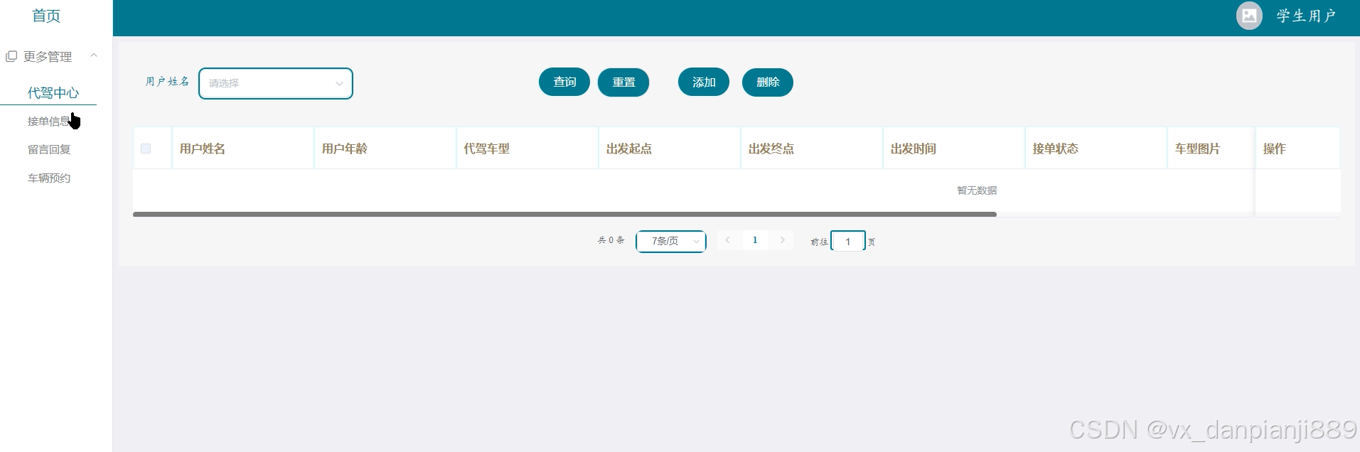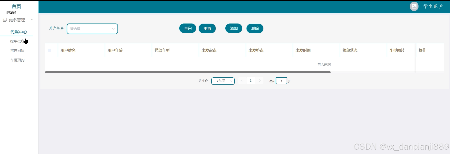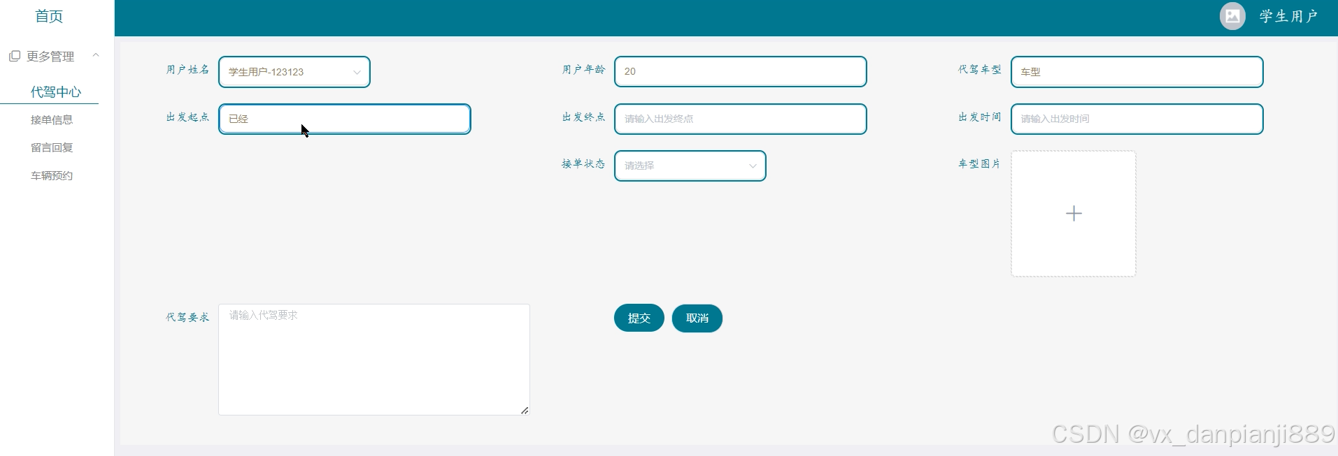 学生用户登录进入系统可以查看后台首页、代驾中心、接单信息、留言回复、车辆预约,如图5-4所示。