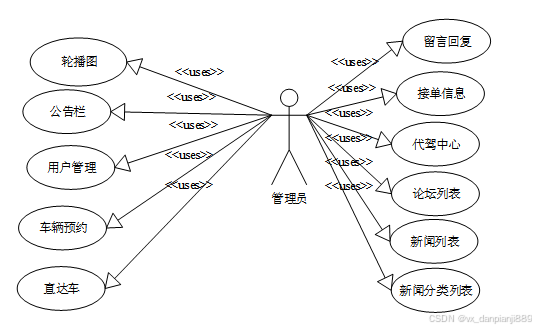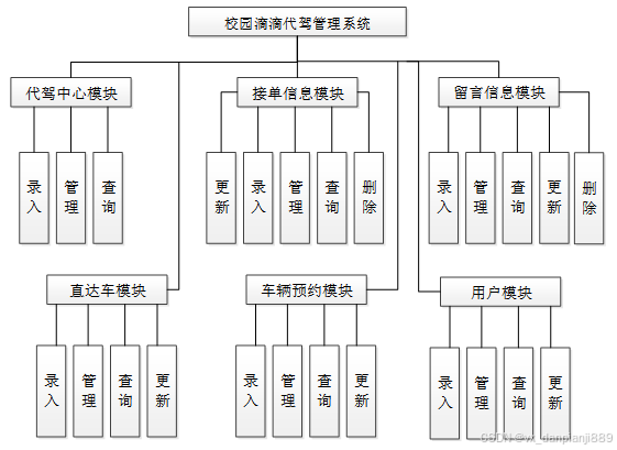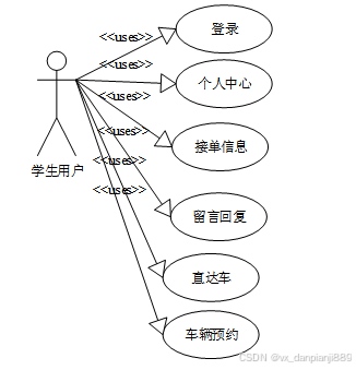 系统设计的目的是分析系统包括的所有功能结构,为开发人员设计开发和实现系统做好准备工作。经过前期的需求调查、分析和整理之后,确定的总体需求主要包括多个模块,分别是:用户管理、代驾中心、接单信息、留言回复、直达车、车辆预约。系统整体角色分为三个部分,一是学生、二是代驾用户、三是管理员。权限分布也是很明显,学生是在除去浏览信息之外还具有查询和管理自己账户信息、用户管理、代驾中心、接单信息、留言回复、直达车、车辆预等权限;管理员是最高权限拥有者。