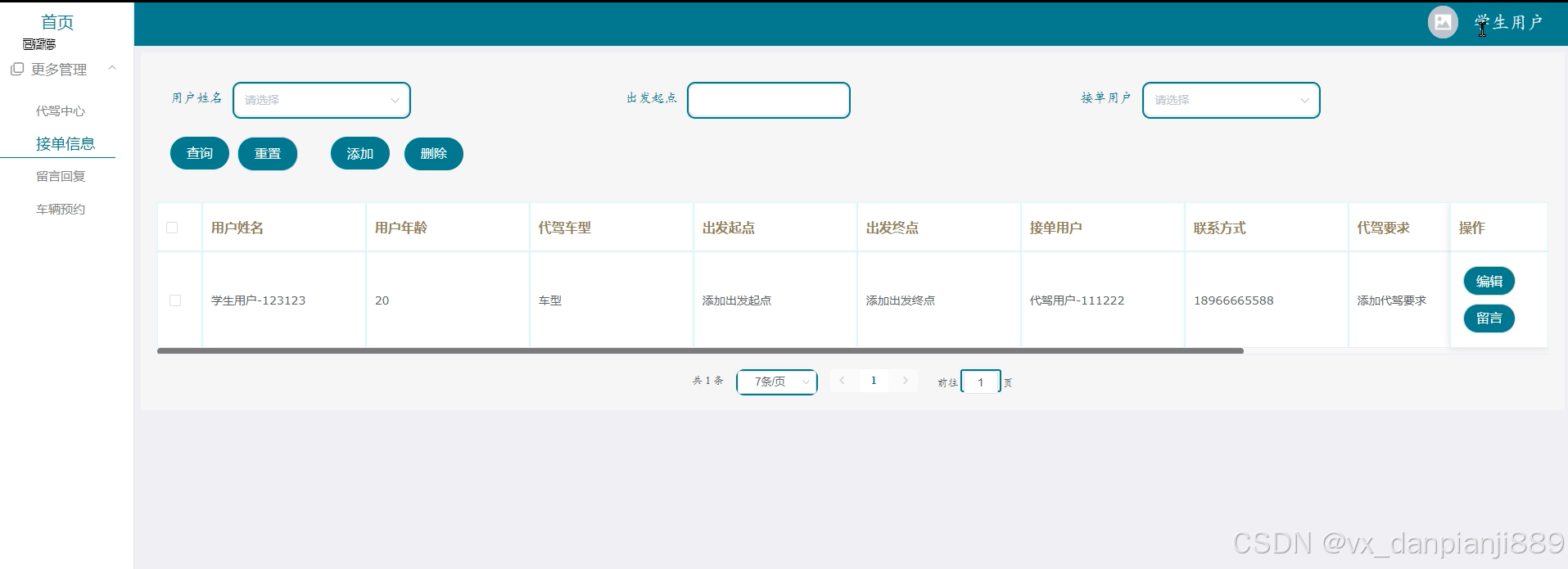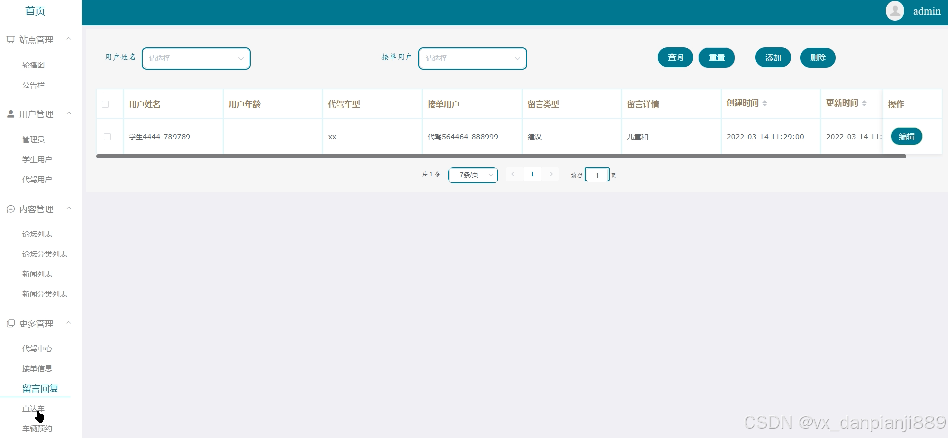 留言回复管理展示,管理员通过输入用户姓名、用户年龄、代驾车型、接单用户、留言类型、留言详情等编辑信息、,并可根据需要进行查询、添加、修改或删除操作,如图5-8所示