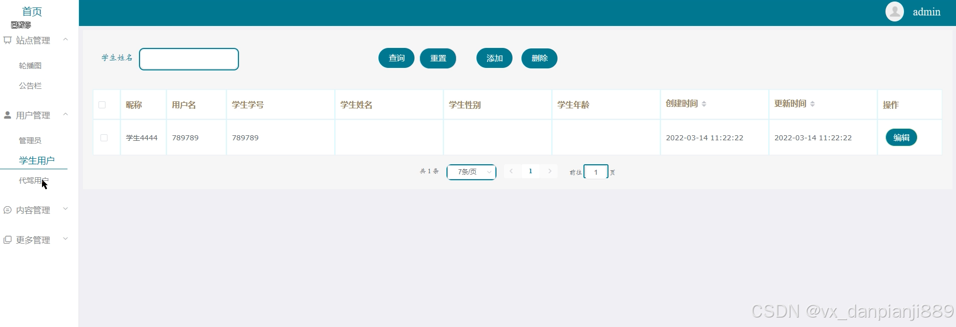 学生用户信息展示,管理员通过输入昵称、用户名、学生姓名、学生性别、学生年龄等信息,并可根据需要进行查询编辑、修改或删除操作,,如图5-7所示