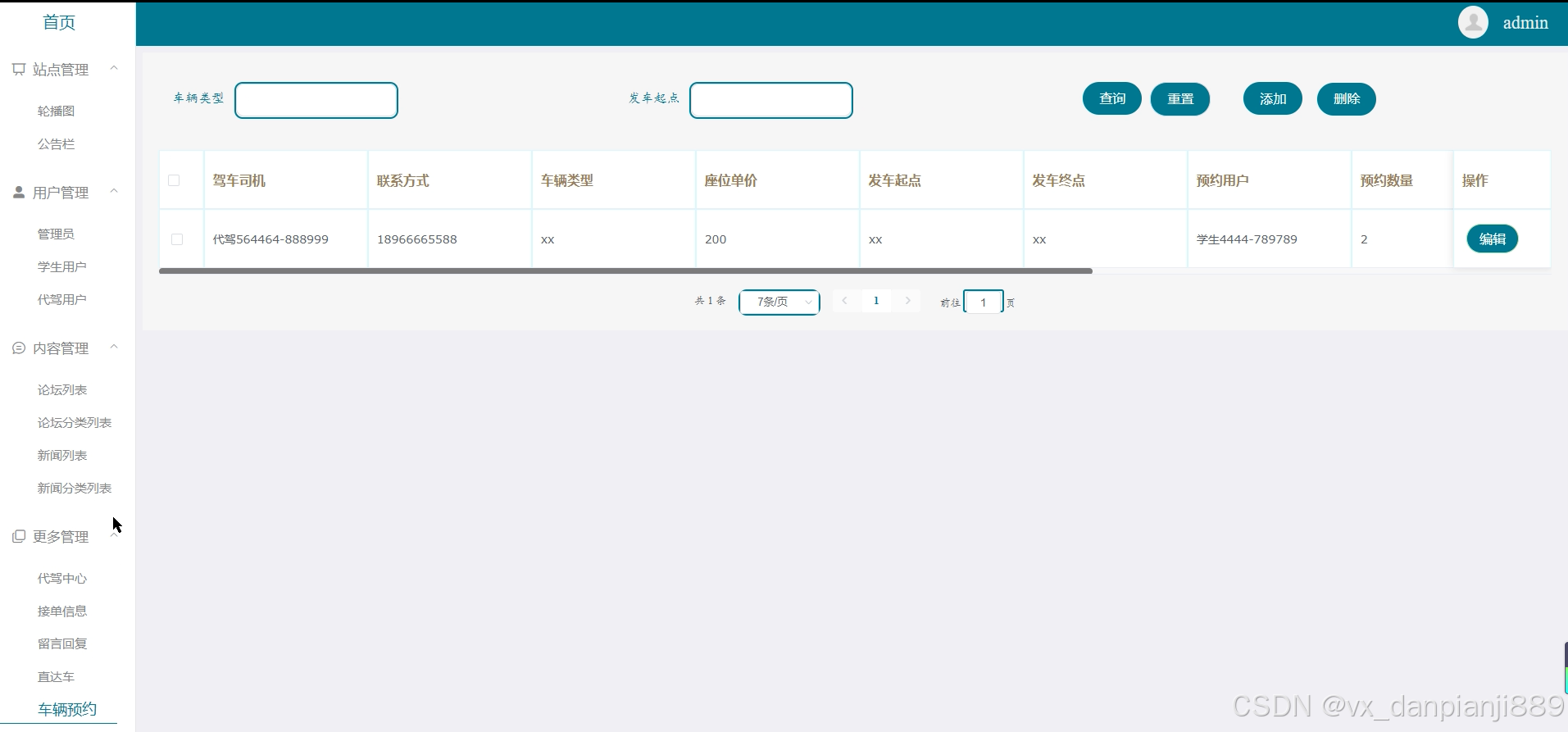 车辆预约展示,管理员通过输入驾车司机、联系方式、车辆类型、座位单价、发车起点、发车终点、预约用户、预约数量等信息,并可根据需要进行编辑、查询、添加、修改或删除操作,如图5-9所示
