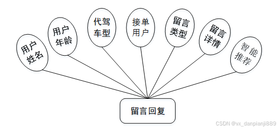 对于一个要开发的系统来说,E-R图可以让别人能更快更轻松的了解此系统的事务及它们之间的关系。根据系统分析阶段所得出的结论确定了在校园滴滴代驾管理系统中存在着多个实体分别是首页、用户管理、代驾中心、接单信息、留言回复、直达车、车辆预约。