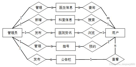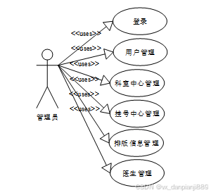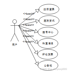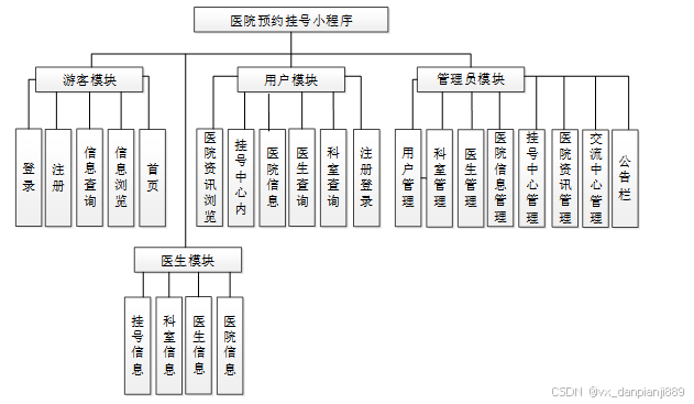 医院预约挂号小程序的功能主要分为前台用户根据自己的需求进行注册登录,浏览医生信息并对选中的医生进行就诊预约操作。后台系统管理员因职责的不同,分为医生和管理员,医生主要对就诊预约订单进行处理,而管理员主要对注册用户,资讯数据,科室详细信息,医生详细信息,挂号预约进行处理。