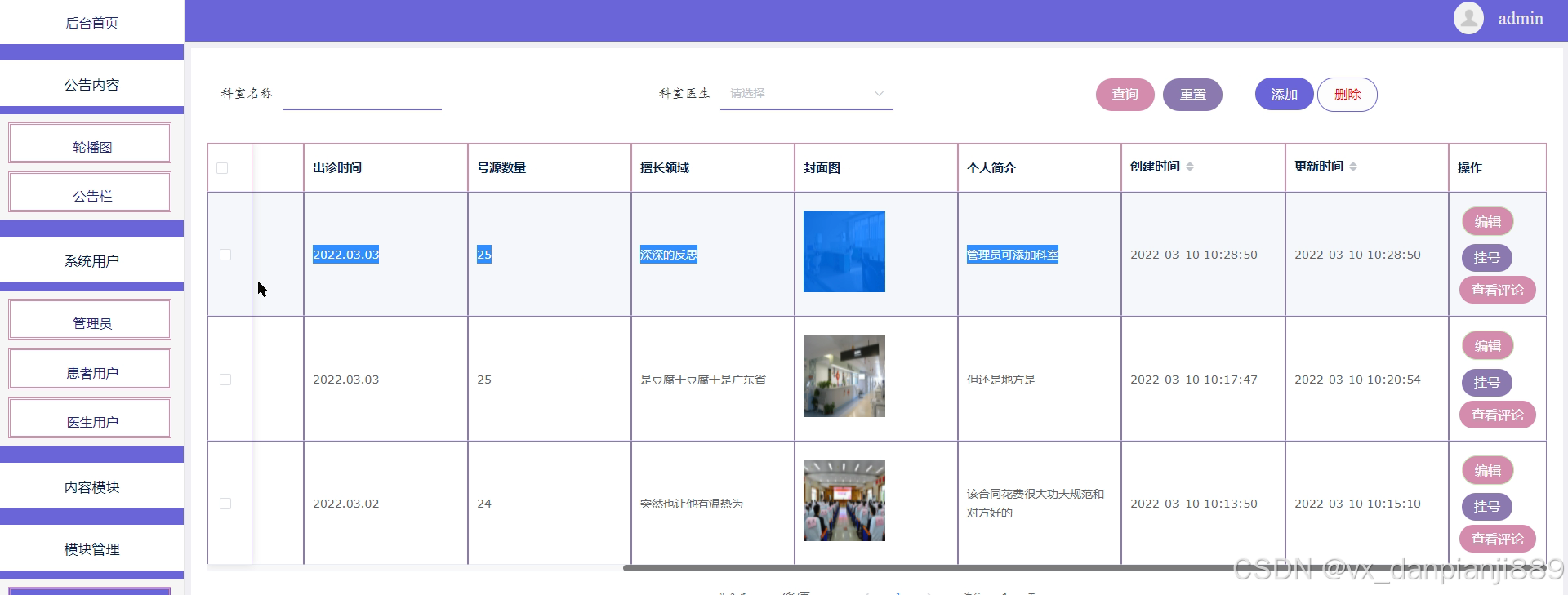 医生信息管理:对医生信息进行维护,添加、删除、修改信息。