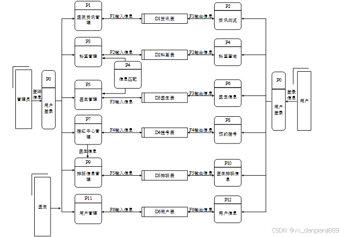 对系统的数据流进行分析,系统的使用者分为二类,一般用户(患者用户、医生),管理员。系统主要对界面信息传送,登录信息的验证,注册信息的接收,用户各种操作的响应做处理。
