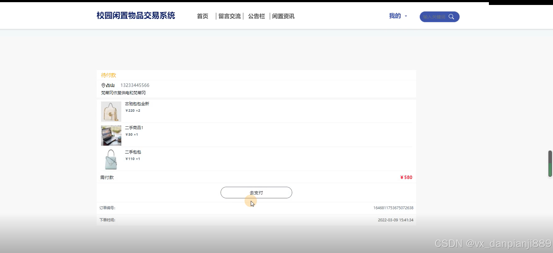 客户可以首次查看详细的介绍,校园闲置物品交易系统中各种商品的实物图,价格和其他基本信息,以便客户可以识别自己满意的商品。选择商品后,客户可以将选择的商品添加到购物车中,如果您在清算前改变主意,仍然可以不用购买。客户选择要购买的商品后,可以将其提交给系统软件,系统软件将自动生成一个相对的订单号。