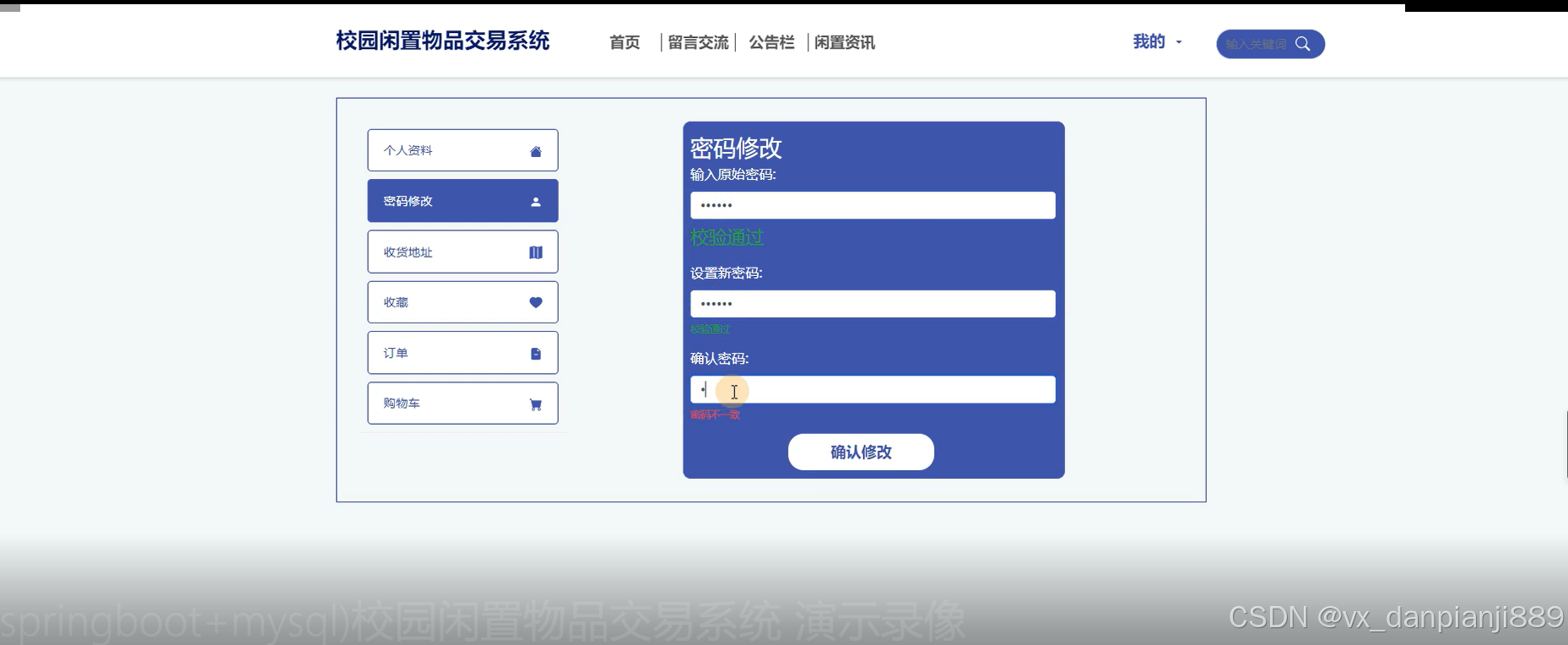 - 密码修改:这个模块中包括原密码、新密码和确认密码。