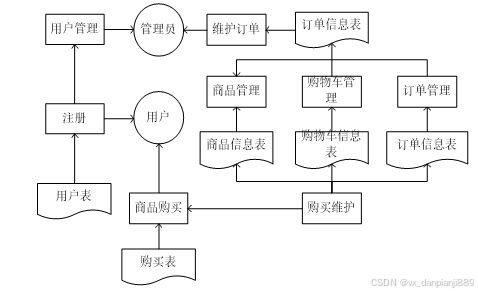 业务流程图(TFD)通过一些特定的符号描述业务的处理过程,它重点强调业务过程中每一项处理活动和具体业务部门的关系,选择部分模块进行具体描述。重点对本系统整体业务中最为主要的商品交易及订单业务进行描述,用户进入校园闲置物品交易系统后进行各种模块信息的浏览,选择想要购买的商品添加到购物车,用户到购物车进行所购商品查询并确认购买、填写订单信息,另外,管理人员进入后端管理,以执行该订单信息控制模块的相关管理方法,并在解决后向客户提供反馈机制。