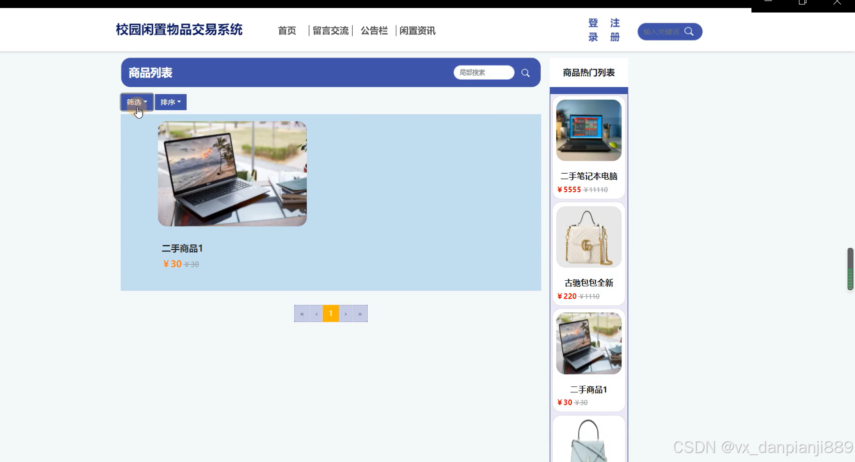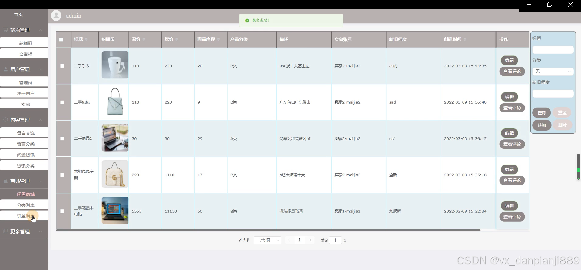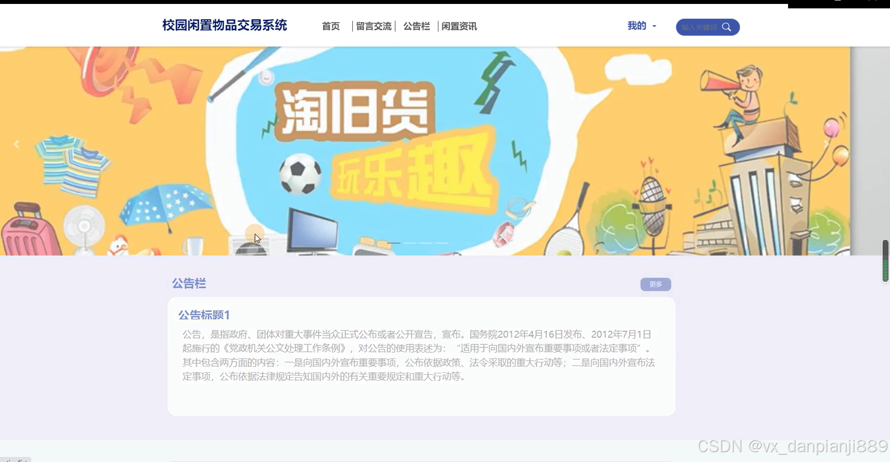 The campus idle goods trading system adopts Java programming language and springboot framework, and uses MySQL database to establish the conversion between data. It mainly realizes the home page Site management (rotation chart and bulletin board), user management (administrator, registered user and seller), content management (message exchange, message classification, idle information and information classification), mall management (idle mall, classified list and order list) and more management (order processing and data statistics) have established a set of scientific and effective management processes for buyers and sellers, It not only reduces the mistakes of traditional commodity sales, but also facilitates people's shopping. The system interface is simple, users can quickly grasp, and effectively improve the work efficiency.