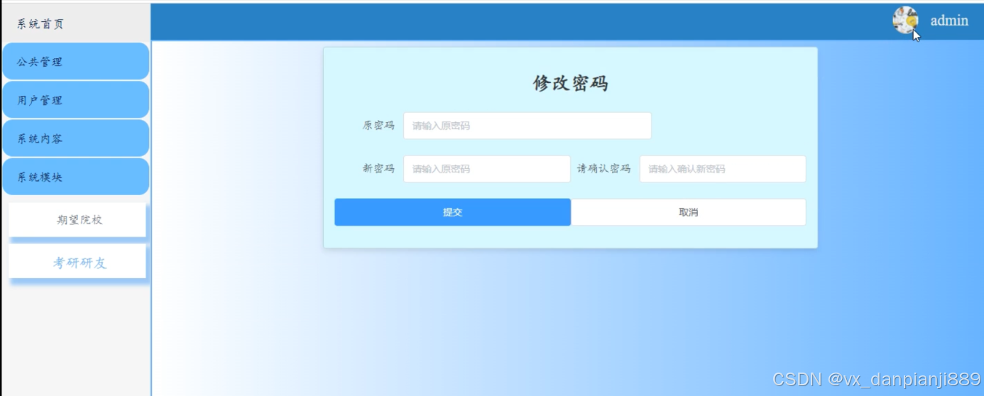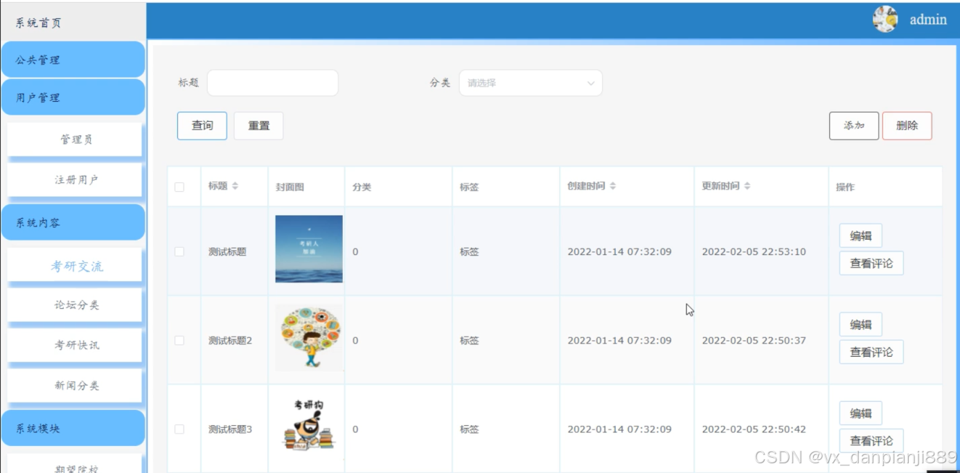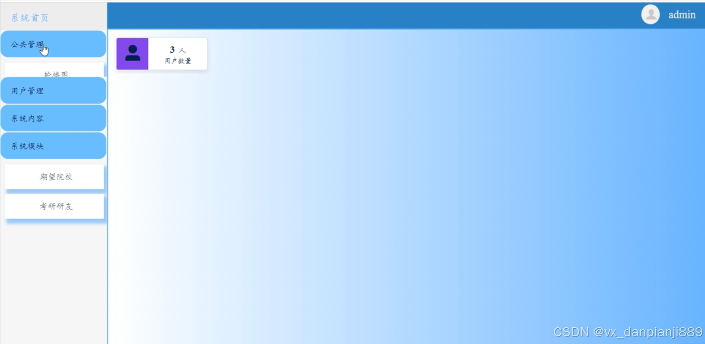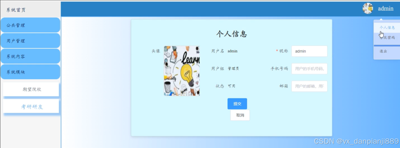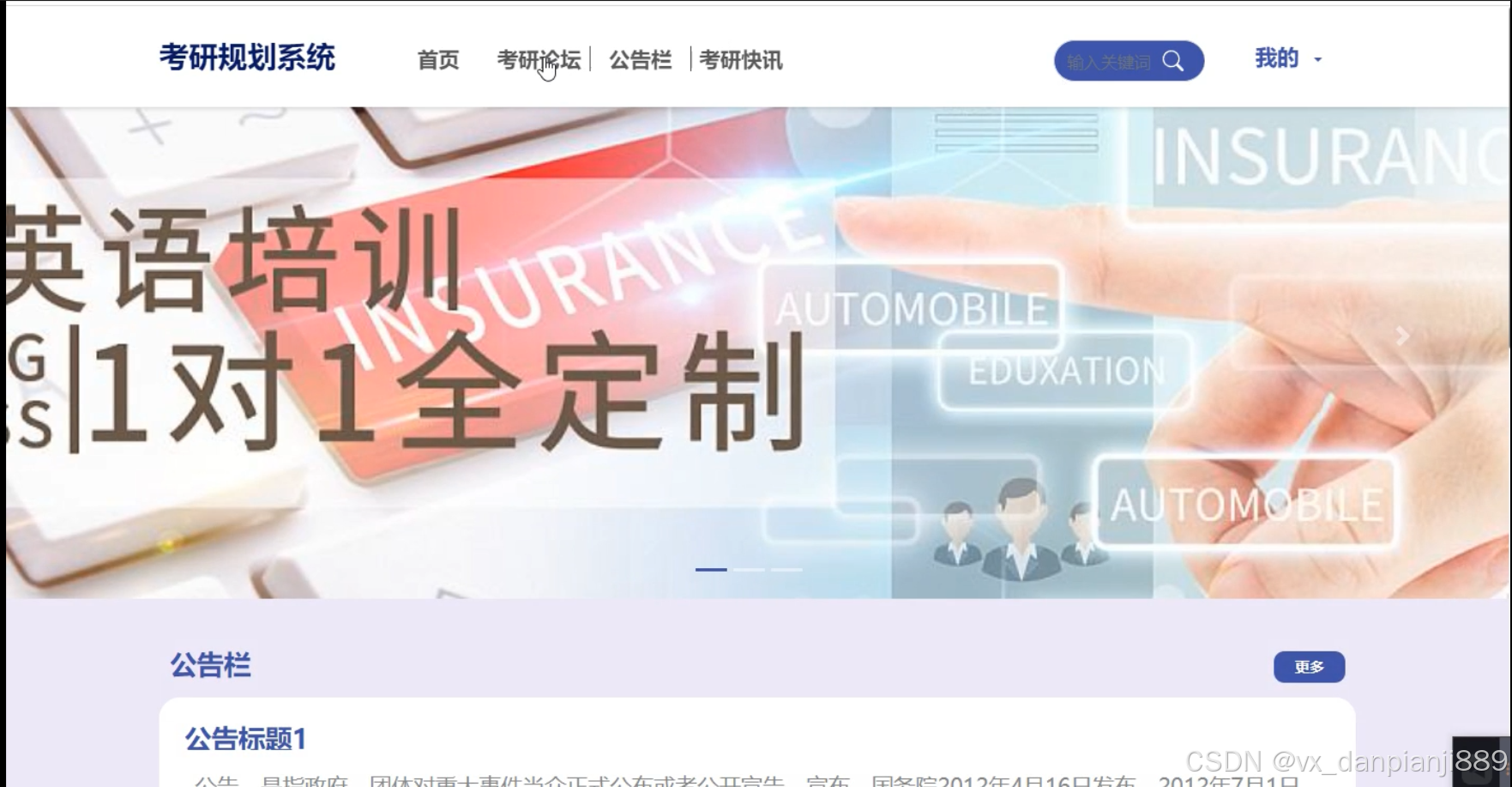 本文以java为开发技术,实现了一个考研规划系统。考研规划系统的主要使用者分为管理员、注册用户;管理员功能分为:首页、公共管理(轮播图、公告栏)用户管理(管理员、注册用户)系统内容(考研交流、论坛分类、考研快讯、新闻分类)系统模块(期望院校、考研研友)。用户:首页、考研论坛、公告栏、考研快讯、我的、期望院校、考研研友等功能。通过这些功能模块的设计,基本上实现了整个考研规划系统的过程。