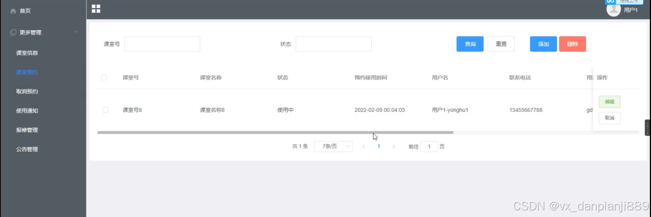 课室预约信息{ID,课室号,课室名称,状态,预约使用时间,用户名,联系电话,用途,审核状态,审核回复,智能推荐,创建时间,更新时间}